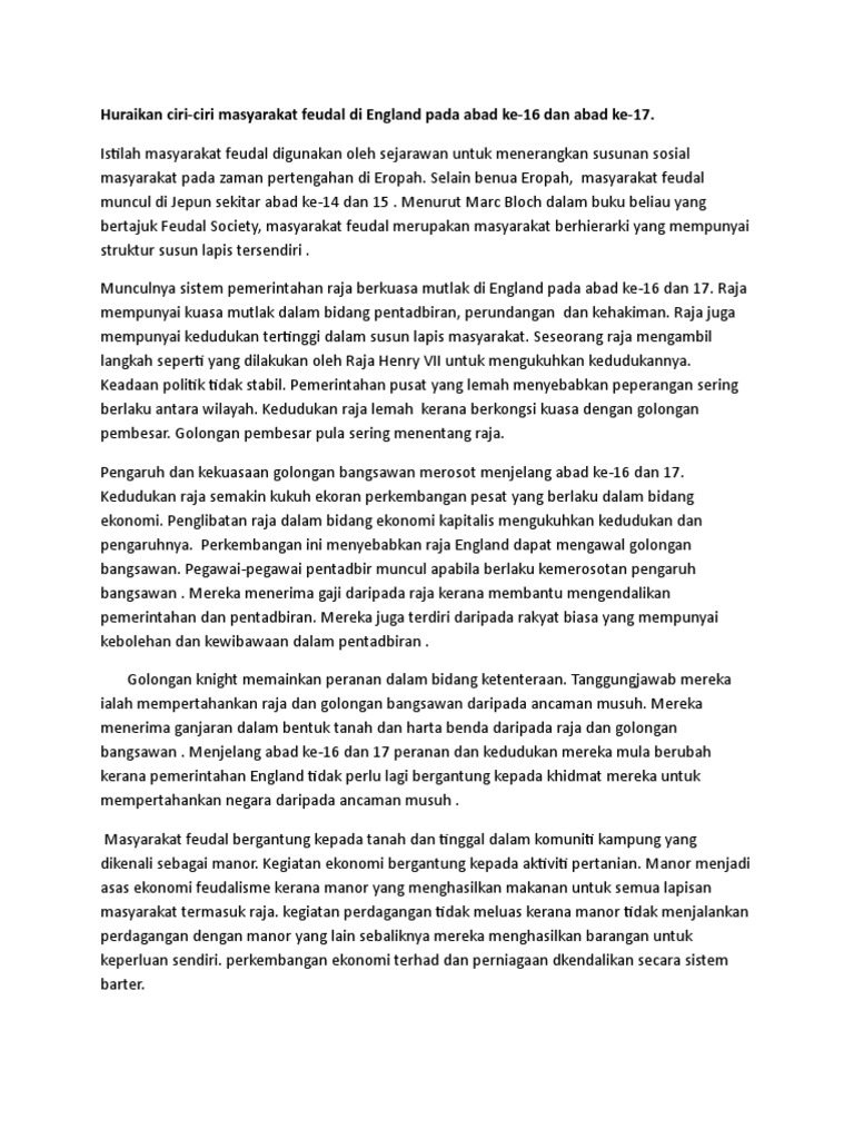 Huraikan Ciri Ciri Masyarakat Feudal Di England Pada Abad Ke 16 Dan Abad Ke 17