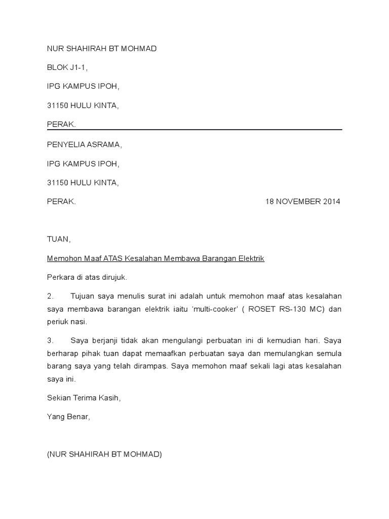 Contoh Surat Rasmi Memohon Maaf Atas Salah Laku Rasmi V Cute766