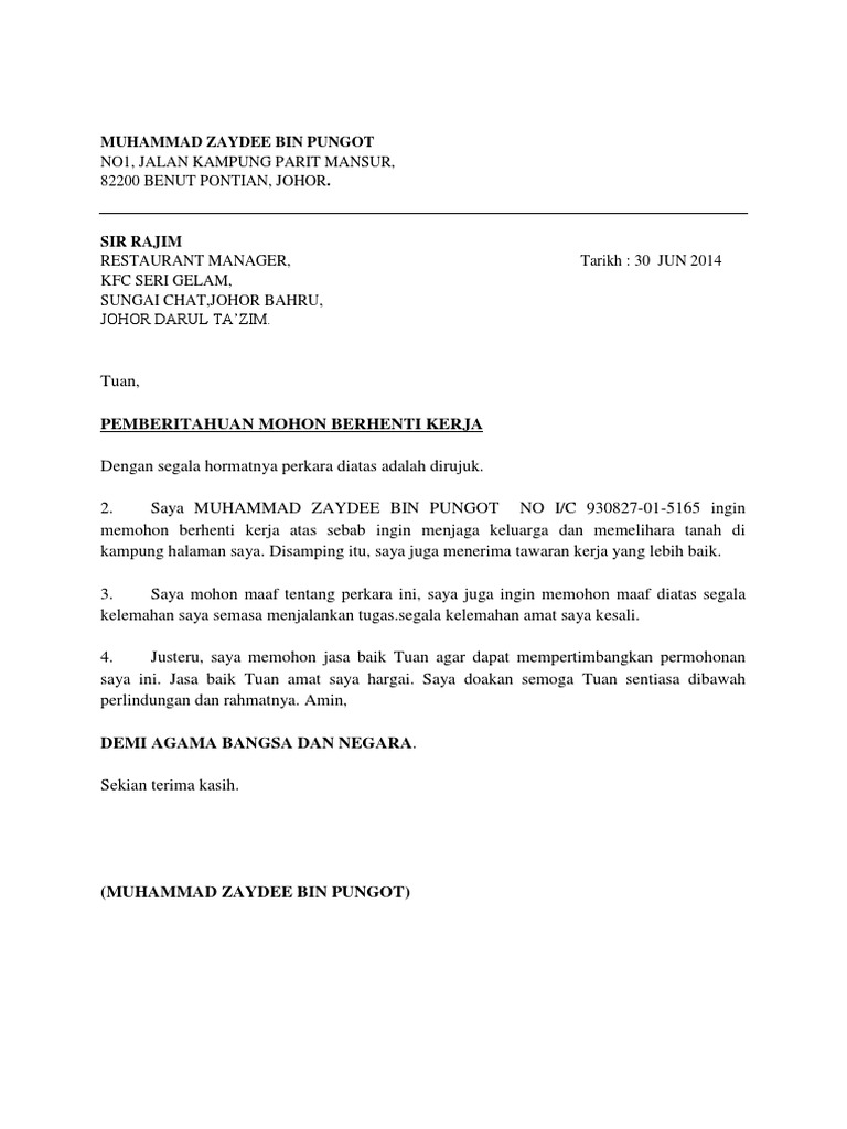 Contoh Surat Rasmi Berhenti Kerja Kfc Resepi Book H